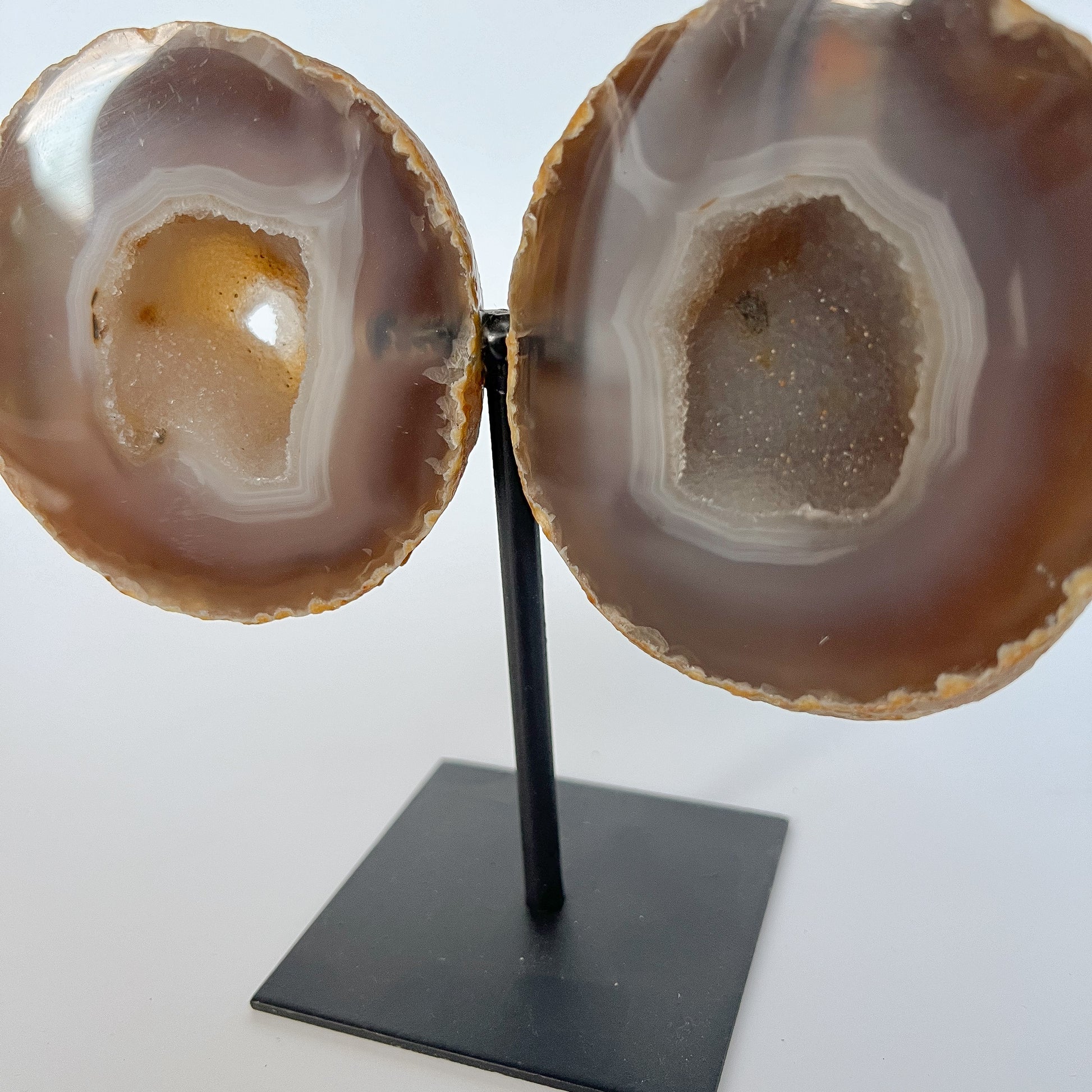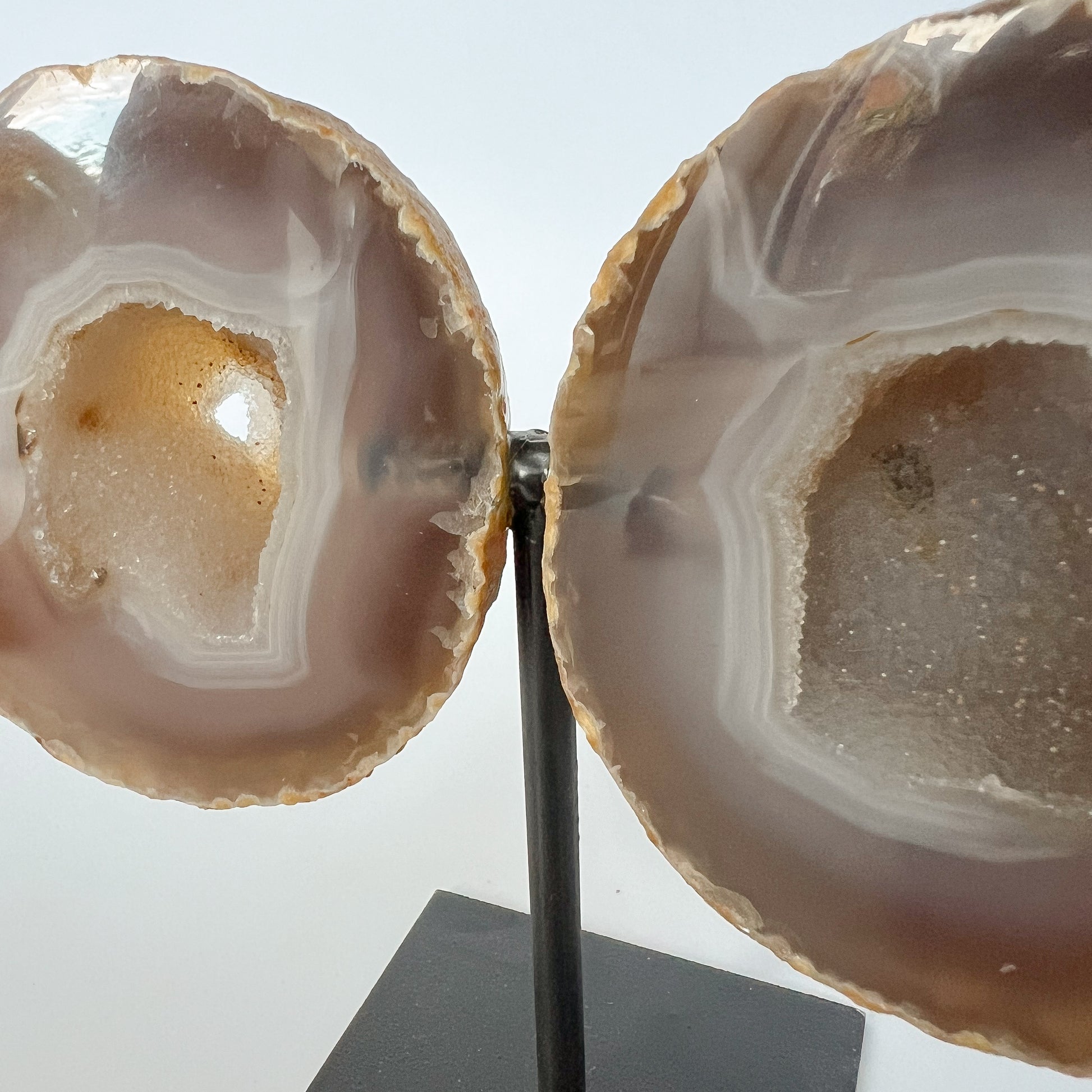 Dieser wunderschöne Schmetterling aus echtem Achat wird auf einem eleganten schwarzen Ständer präsentiert. Jeder dieser Schmetterlinge ist ein einzigartiges Kunstwerk mit individuellen Farbnuancen und Maserungen.